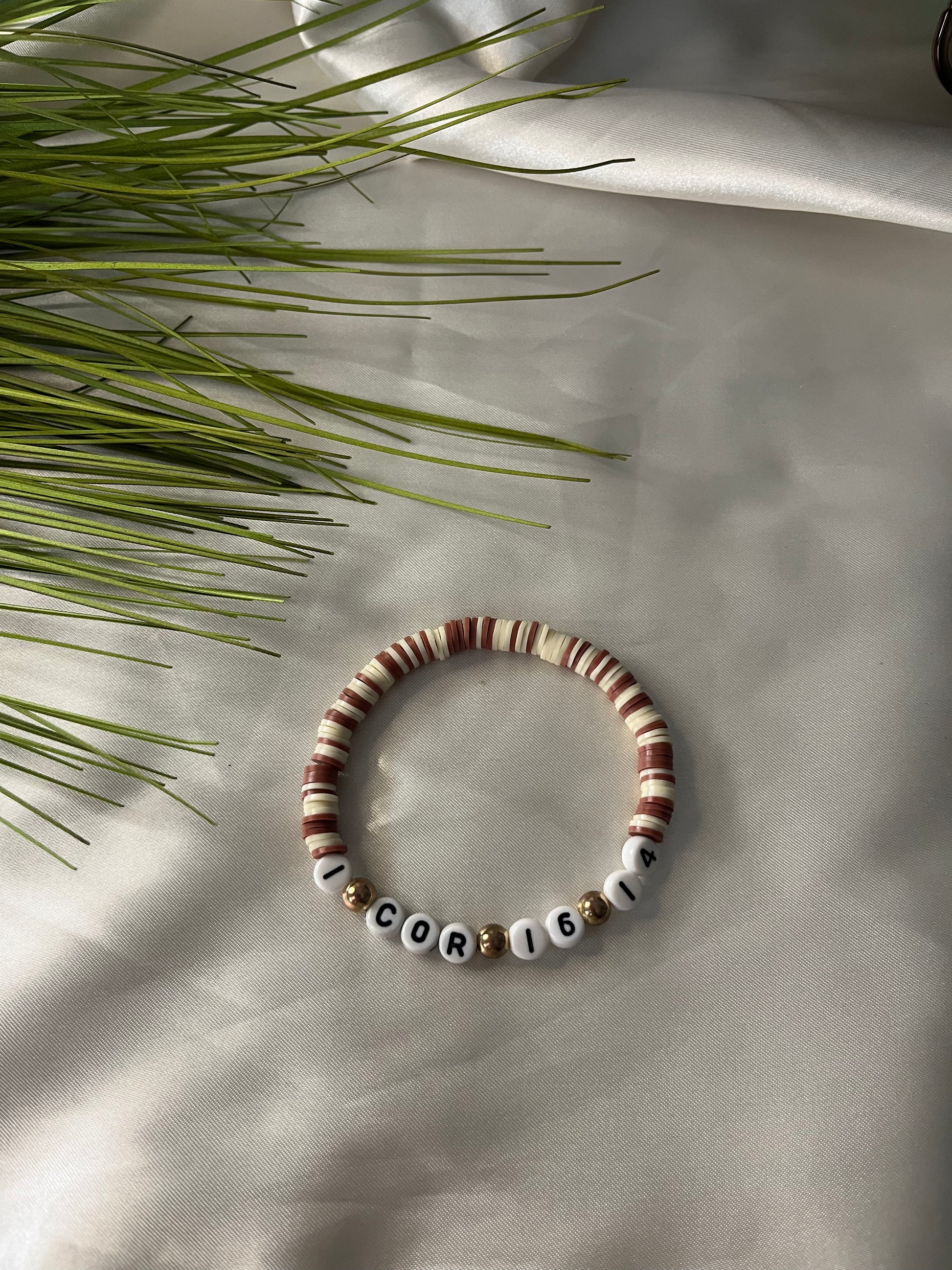 • Centerpiece letter beads spell out “1 COR 16:14”