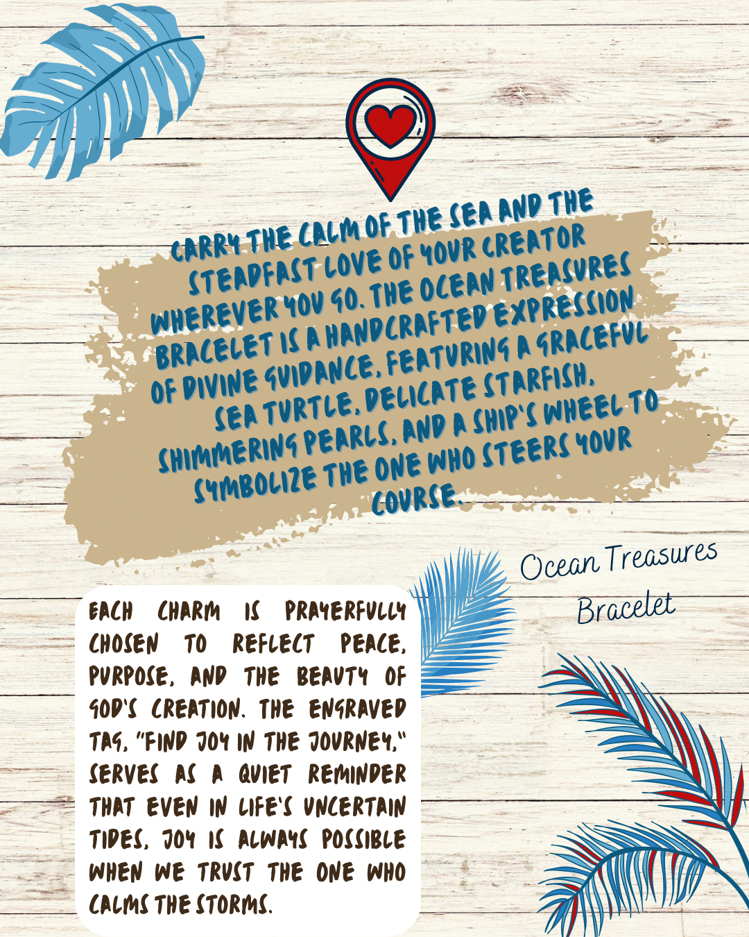 Carry the calm of the sea and the steadfast love of your Creator wherever you go. The Ocean Treasures Bracelet is a handcrafted expression of divine guidance, featuring a graceful sea turtle, delicate starfish, shimmering pearls, and a ship’s wheel to symbolize the One who steers your course.